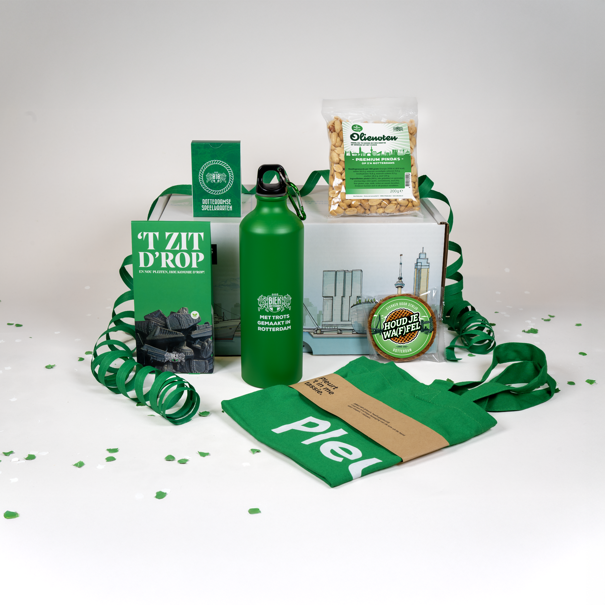 Dit is “groen-wit-groene”-pakket past voor elke gelegenheid. Samengesteld met de populairste groen-wit-groene Rotterdamse producten. Met als inhoud: