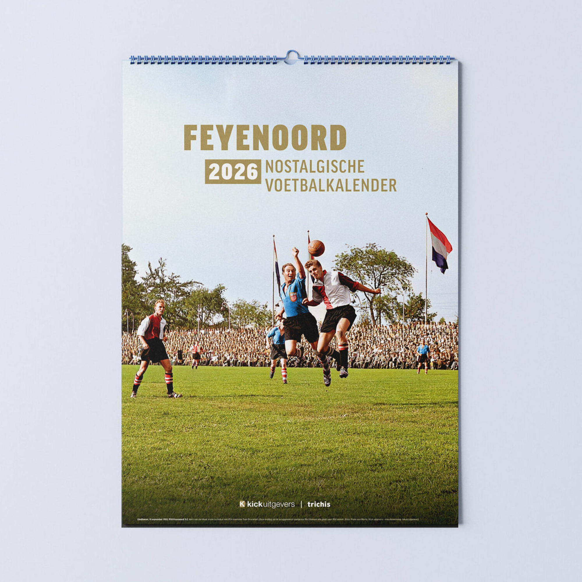 Feyenoord nostalgische voetbalkalender 2026 komt dit jaar weer! Deze unieke extra grote kalender is 42 x 60 cm groot en bevat 13 schitterende full-colour foto’s uit het rijke verleden van Feyenoord. Op de cover zie je onze eigen Hans van der Hoek in een luchtduel met PSV-aanvaller Toon Brusselers.
